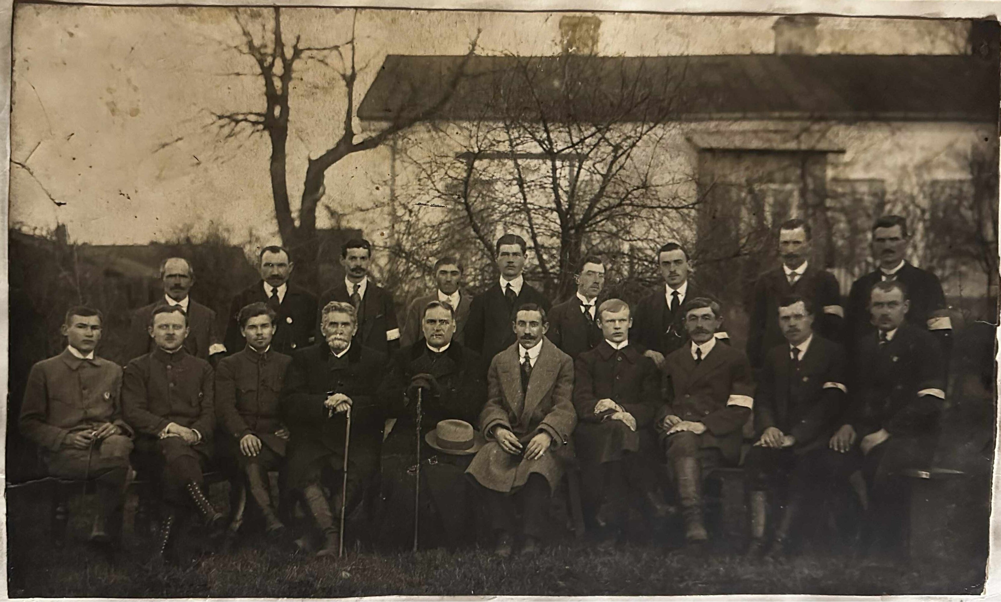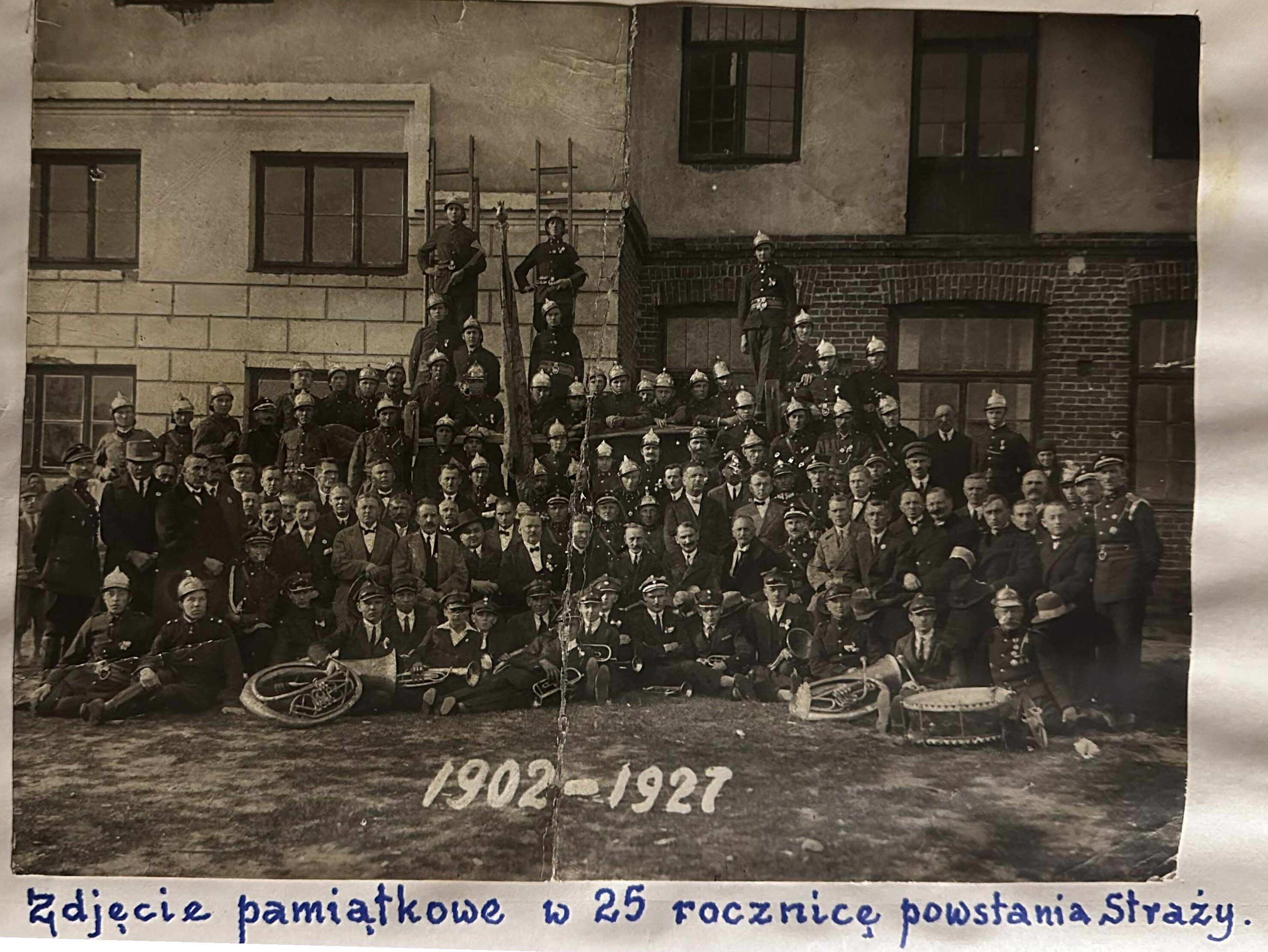Zdjęcie przedstawia strażaków OSP Kałuszyn wykonane najprawdopodobniej w drugiej połowie drugiej dekady XX wieku, na tle drewnianej szopy na narzędzia pożarnicze wybudowanej w 1850r.