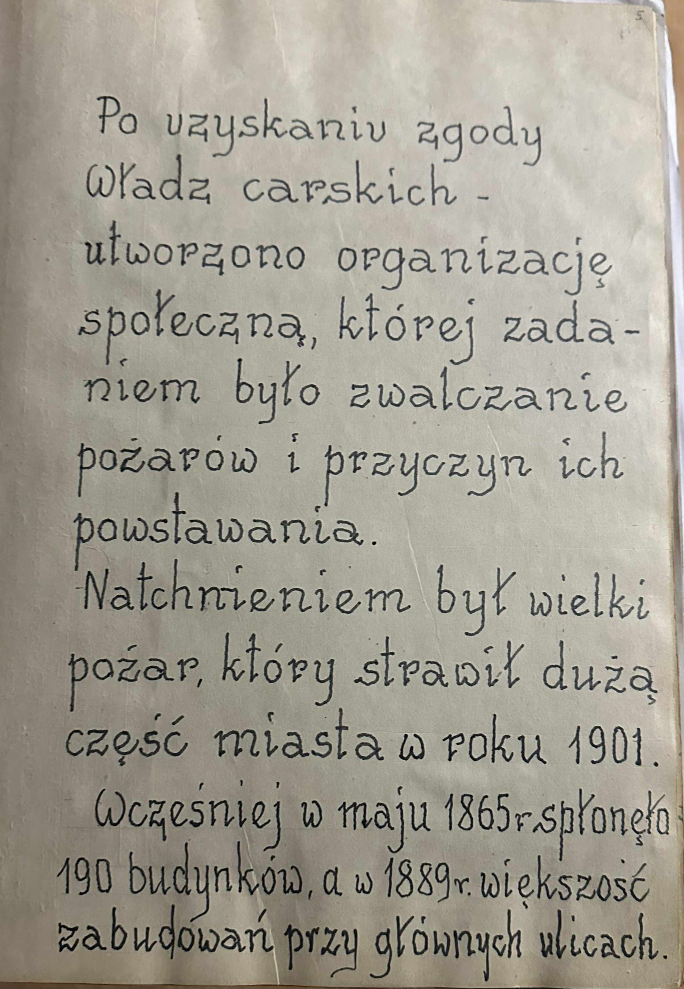 Utworzenie organizacji było możliwe po uzyskaniu zgody władz carskich, a jej zadaniem stało się zwalczanie pożarów i przyczyn ich powstawania na terenie miasta. Zapał mieszkańców oraz inspiracja tragicznymi wydarzeniami pozwoliły powołać do życia stowarzyszenie, które od początku swojego istnienia aktywnie angażowało się w życie społeczne i bezpieczeństwo lokalnej społeczności.